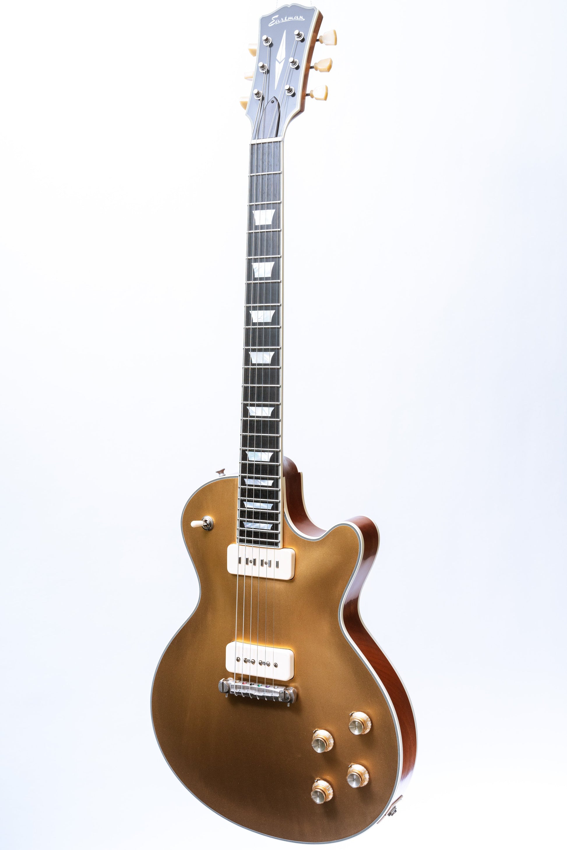 Eastman is a company based out of Beijing, specializing in high quality and hand crafted instruments. This guitar features a carved maple top with an Okoume body, has a traditional even C profile Okoume neck with a 12 radius ebony fingerboard, and has a Lollar Staple P90 in the neck and Lollar Custom Wound/Aged Soapbar P90 in the bridge. If you have any questions, feel free to let us know!