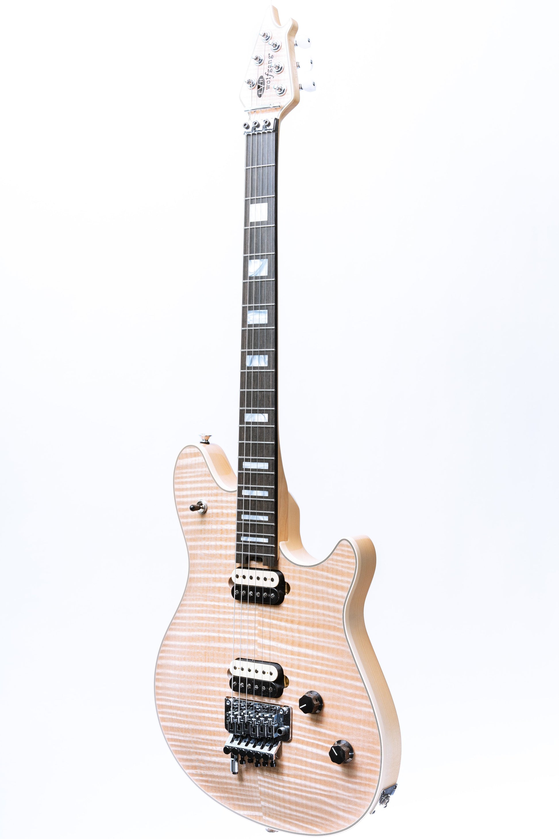 The Wolfgang USA features a basswood body with either an arched big-leaf maple or 5A flame maple top, bolt-on quartersawn maple neck with graphite reinforcement, 12" - 16" compound radius ebony fingerboard with 22 vintage stainless steel frets and mother of pearl block inlays (dot inlays on Stealth), direct mount EVH Wolfgang USA zebra humbucking pickups, three-way toggle switching with reverse wiring, volume control with 500K EVH Bourns low friction pot with treble bleed circuit, tone control with 250K EVH Bourns high friction pot, EVH-branded Floyd Rose locking tremolo bridge with EVH D-Tuna and EVH-branded Gotho High Ratio die-cast tuners with white pearloid buttons.